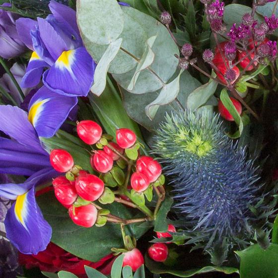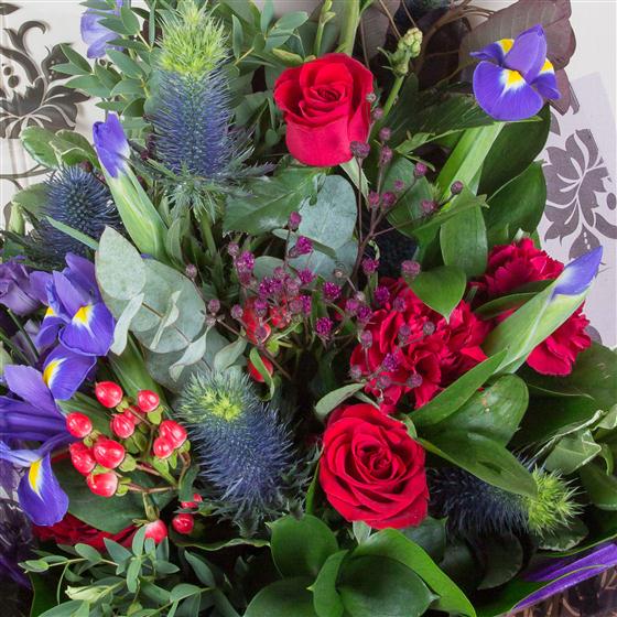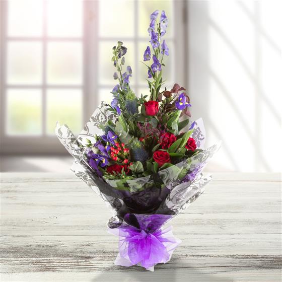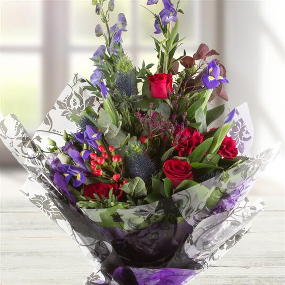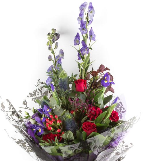 An impressive hand-tied bouquet in shades of red and purple including aconitum, eryngium, iris and roses.