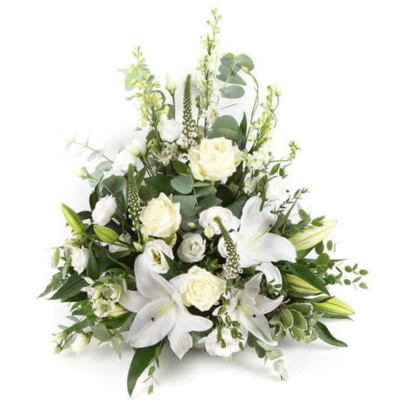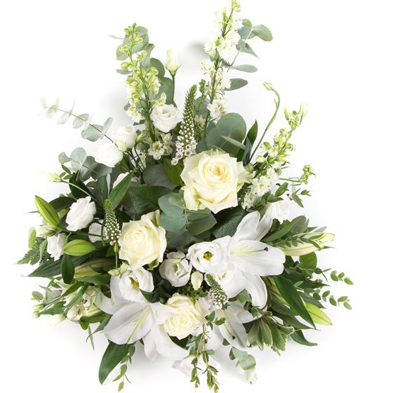 A front facing arrangement of white and cream blooms including roses, scented lilies and lisianthus.